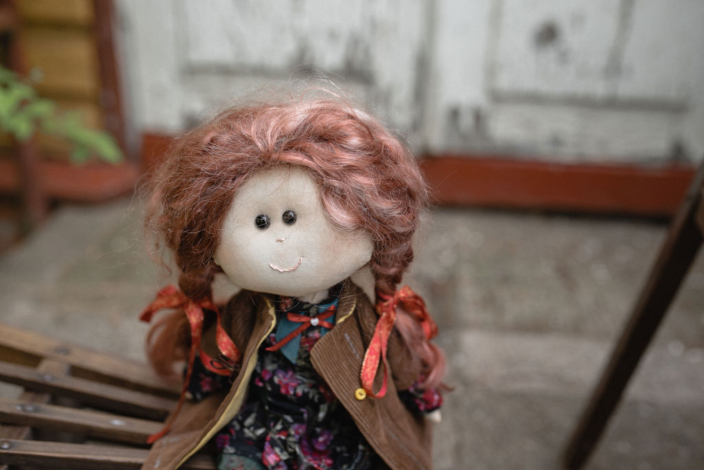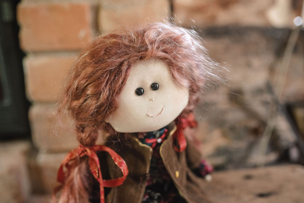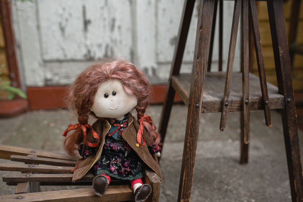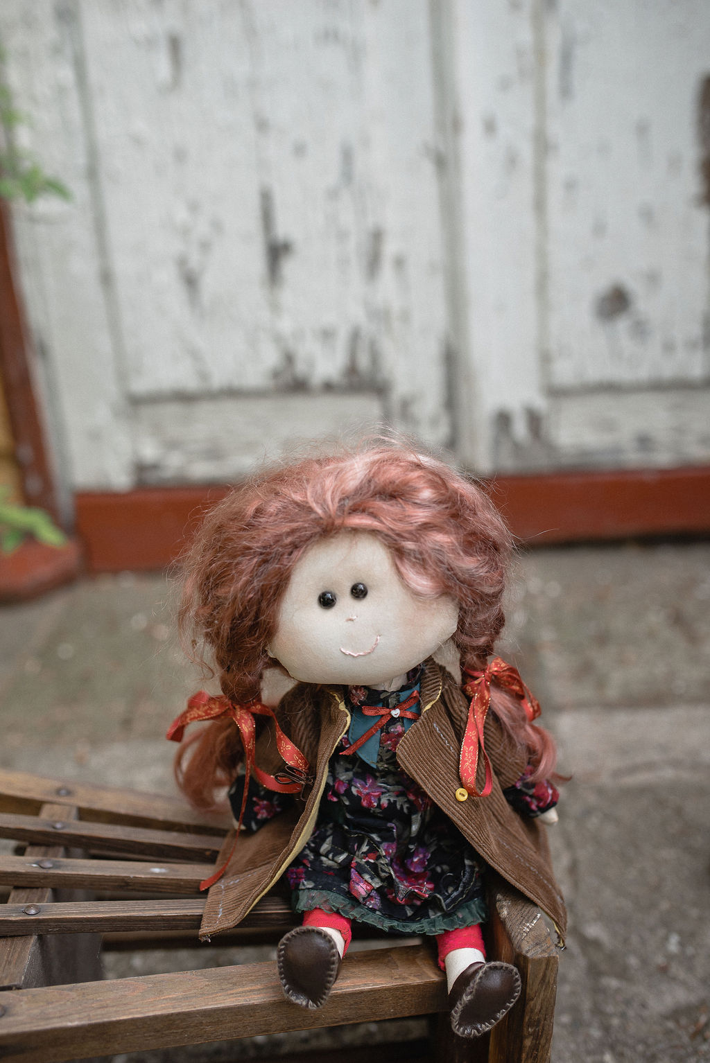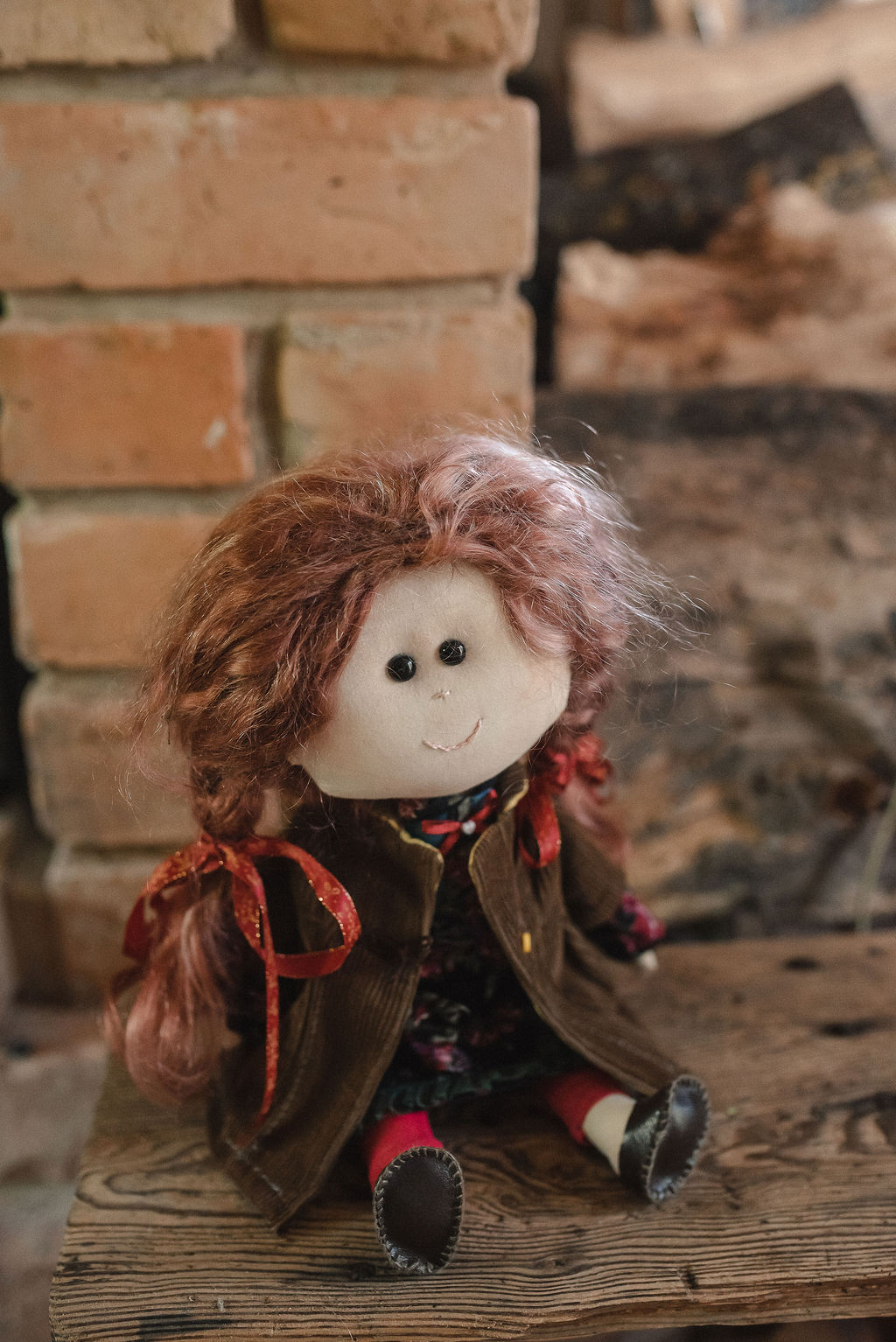 „RUSNĖ“ – rudens spalvų lėlė – su aksominiu švarkeliu ir kaspinais, tarsi iš senos nuotraukos. Jos žvilgsnyje – smalsumas ir šiek tiek šėliojimo, o drabužių spalvos atkartoja Lietuvos tarpukario mados šilumą.
